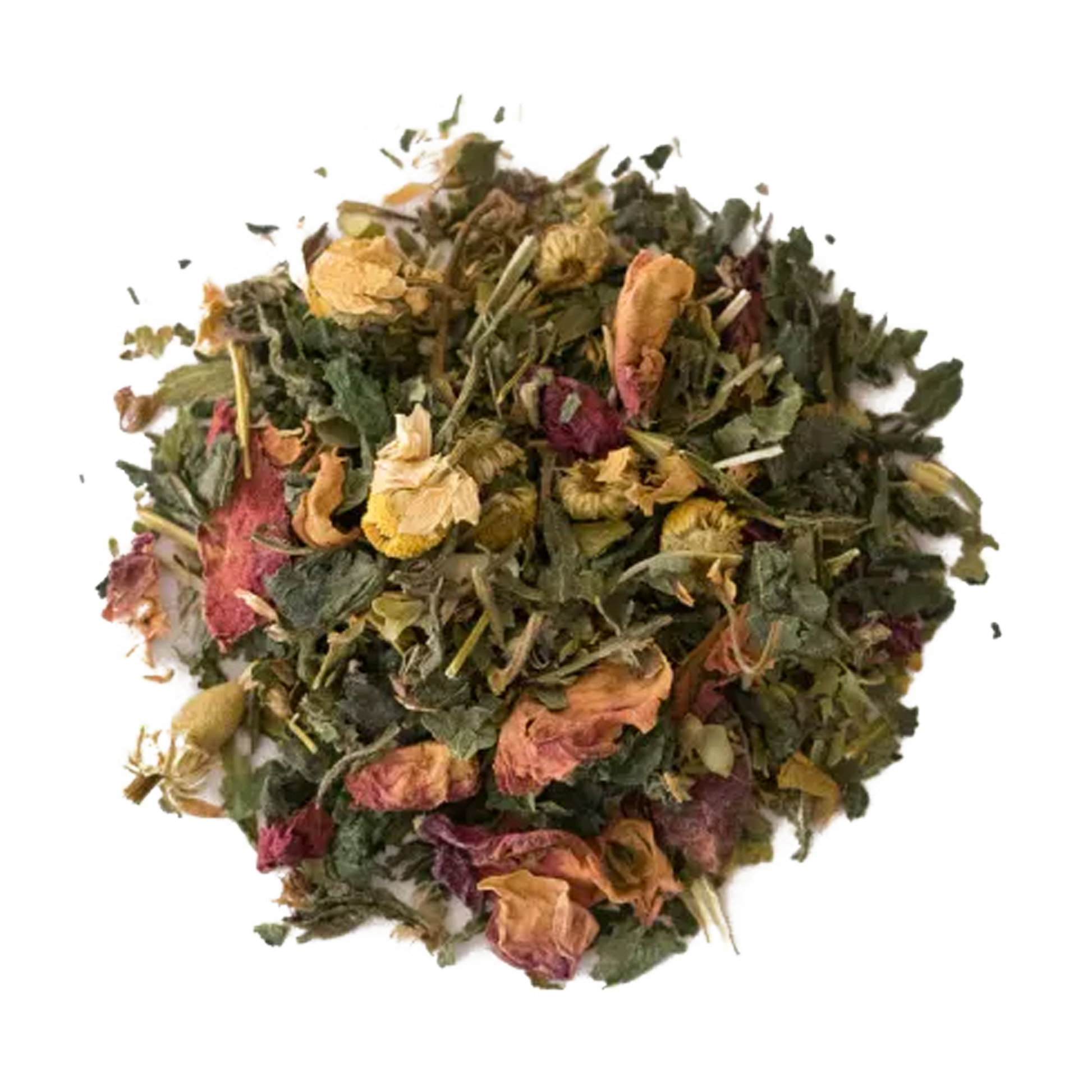 organic nettle leaf, organic scullcap, organic catnip, organic red clover, organic tulsi, organic chamomile, organic rose petals, organic passionflower